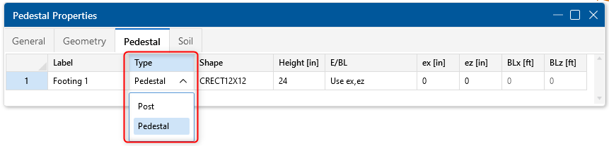 The height of the pedestal can be specified under the Height column along with any pedestal eccentricities (ex and ez). Boundaries can also be specified to limit the pedestal eccentricity from the center of the footing (BLx and BLz).
