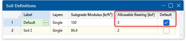 When a Gross Soil Pressure is specified, the load is compared directly against the Default Allowable Bearing (user-entered) value in the Soil Definitions Spreadsheet: