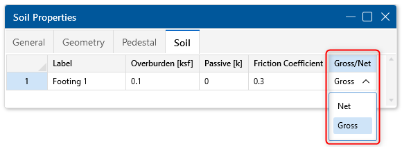 Allowable Soil Bearing values are typically supplied by the Geotechnical Engineer as either Gross or Net allowable values. The Gross or Net Soil Pressure can be specified in the Footing Definitions spreadsheet under the Soil tab. In RISAFoundation, the option to choose between gross and net soil pressures is only available for footings.