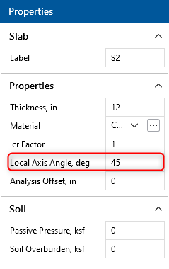 RISAFoundation has the ability to change the Local Axes for slabs. This is useful when you have a slab that is skewed from the global axis. RISAFoundation will perform the sliding and overturning checks based on the skewed local axis.