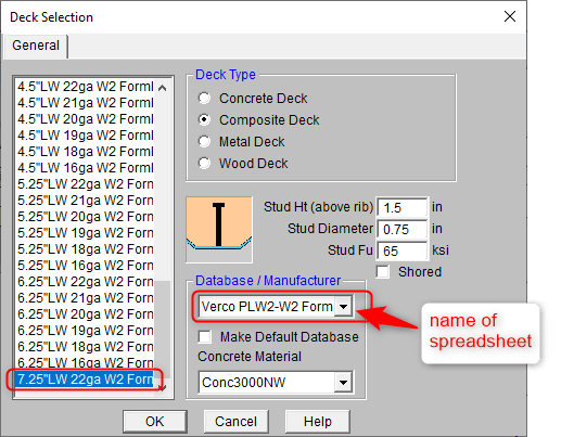 To apply your custom deck properties, close and reopen RISAFloor. Open the Deck Selection dialog to see the updated deck information listed. Choose the Database/Manufacturer from your updated Excel Database. Select the new custom deck from the entries.