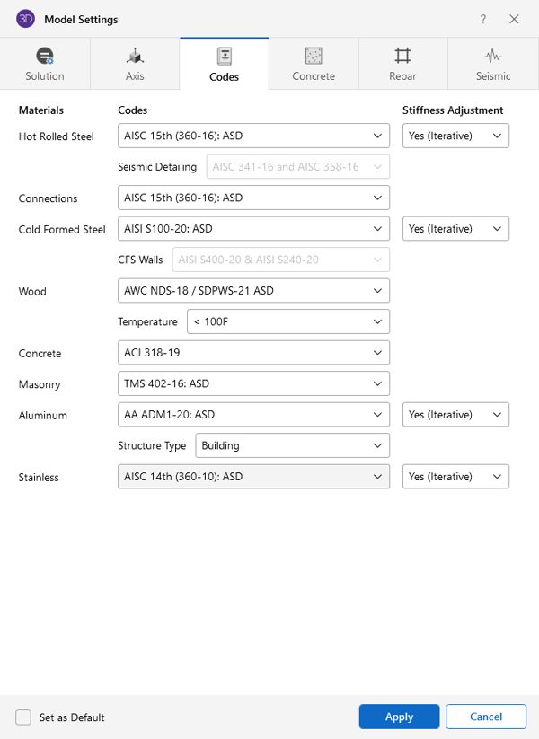 To select these codes for your design, simply choose them from the Codes tab of Model Settings: