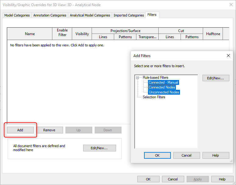 In the Filters window, click Add and select the filters you created. Hold CTRL to select multiple filters and click OK.