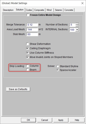 Essentially, if the Skip Loading box for Column or Beam is checked, the program will automatically design the members for the controlling combination of unbalanced live load at each floor. When the box is unchecked for columns, the columns will only be checked for the case where gravity loads from all sides of the column act concurrently. For more information please see Column Skip Loading in our Help File. Turning off the Beam and Column Skip Loading could allow your model to solve much faster. Go to your Model Settings in RISAFloor. Then in the Solution tab, uncheck Column/Beam skip loading.