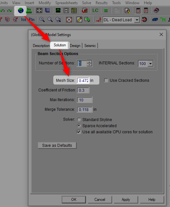 If your model solution is very slow, we suggest reviewing these FEA mesh size settings. You may need to increase this mesh size. This mesh setting is found in your Model Settings, then open the Solution tab.