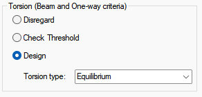 Torsion design has been implemented for the ACI318-19 and ACI318-19(22) codes. You can design torsion using the Equilibrium method of ACI318-19(22) 22.7.3.1, or the Compatibility method of ACI318-19(22) 22.7.3.2.