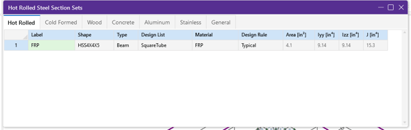 Section Sets are a great way to set up FRP members. Typically, every FRP member should be set up and labeled under Type (such as beams, columns, braces, etc.). Setting up RISA-3D in all other respects is the same as any other created model. These inputs include boundary conditions, joint coordinates, basic load cases and load combinations.