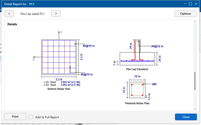 The Pile Cap Detail Report includes comprehensive images of the pile cap geometry and reinforcement design of the pile cap, pedestal, and piles: